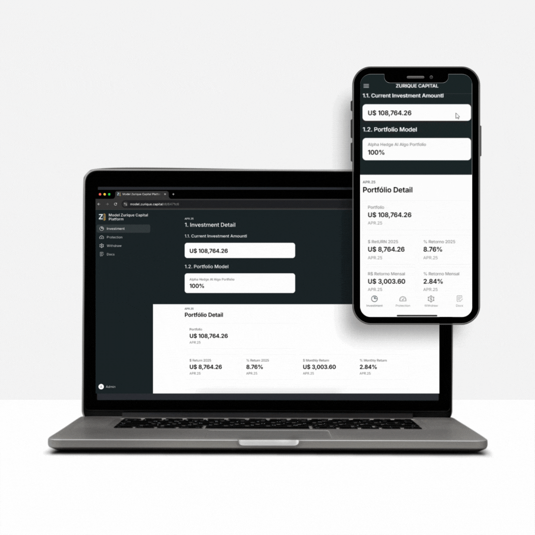 Your assets remain securely under your control in a regulated bank account in your name. Zurique Capital simplifies onboarding, and our algorithm executes transparent, secure strategies directly through our platform in your account for a flat fee.